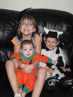 It was a really fun night. Elisa started the night as a farmer - b/c Syd is a cow. But ended the night as Super Girl - actually she decided she was actually Word Girl. She also wore a scarf around her nose while carving the pumpkin because of the smell. Funny. I also love Maya's expression in the pic w/ all 3 girls - like "what the heck is going on?" Hilarious.